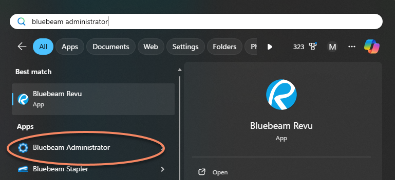 Click windows start button and search for Bluebeam Administrator.