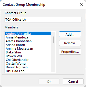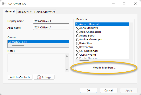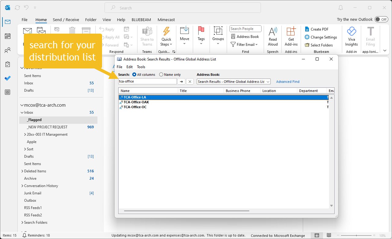 Find your distribution list you want to manage. (TCA-Design-OC, TCA-Design-LA, TCA-Design-OAK)